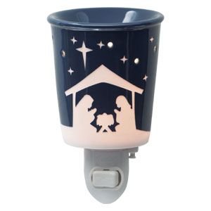 Recalling the long ago night in Bethlehem where it all began, Silent Night features a Nativity scene lit from within, complete with vent holes shaped like brightly shining stars. In deep indigo and ivory, this warmer glows with tradition and “heavenly peace.” |